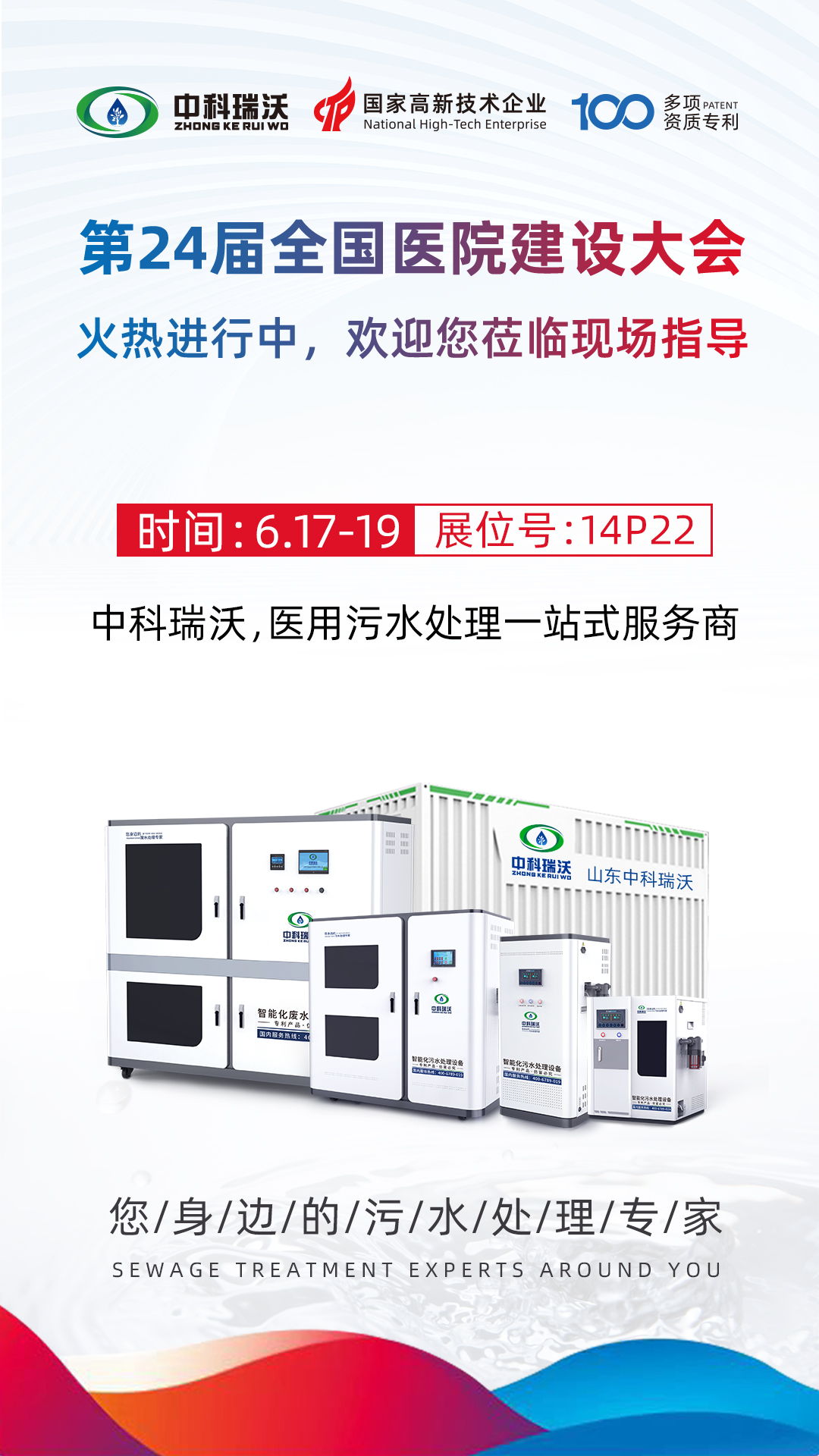 此次展會(huì)為期三天,6月17-6月19號(hào)您都可以蒞臨全國(guó)醫(yī)院建設(shè)大會(huì)中科瑞沃展位,我們將為您提供專業(yè)系統(tǒng)化的醫(yī)用污水解決方案!